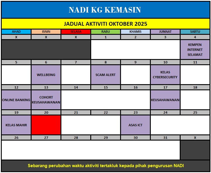 TARIKH : 17 OKTOBER 2025 MASA : 03:00 PETANG – 04:00 PETANG TEMPAT : NADI KG KEMASIN AKTIVITI : KELAS CYBERSECURITY